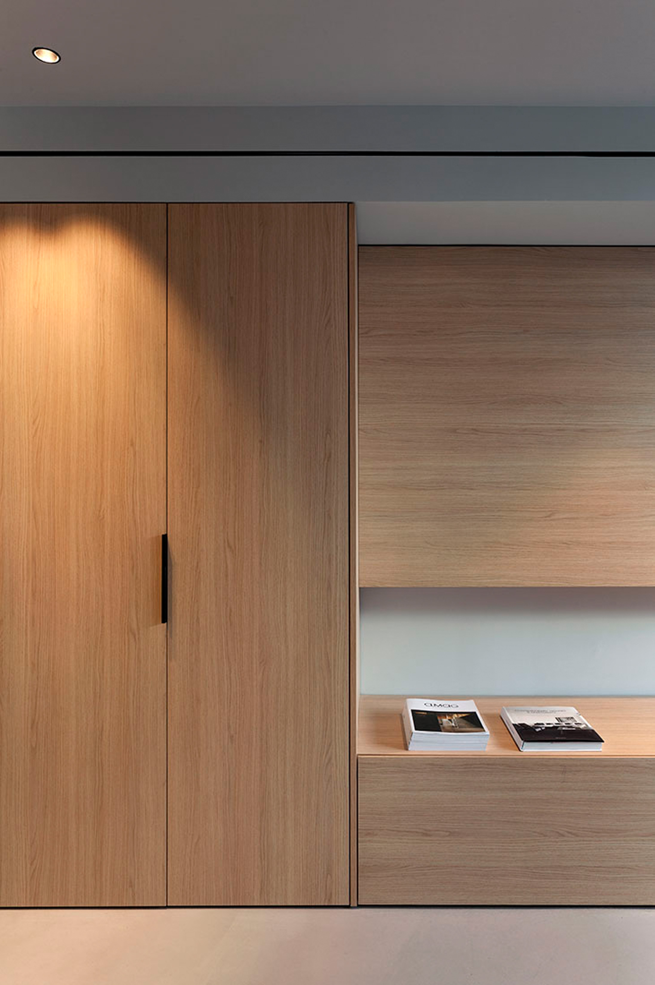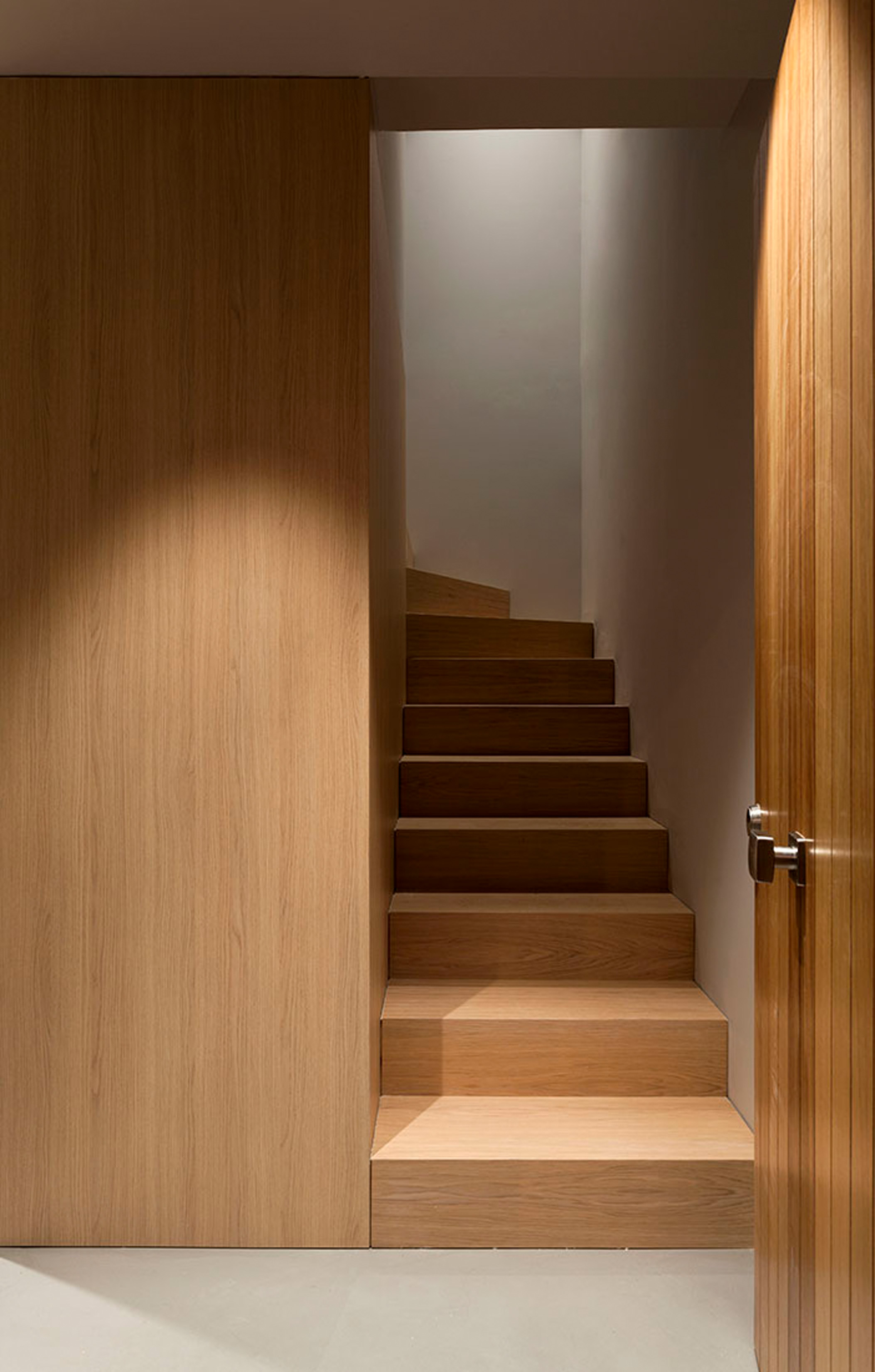 Un espacio con las mínimas particiones posibles, que agrupa los elementos de servicio en un volumen integrado por cocina, aseos y escaleras. Toda la vivienda mantiene un tono neutro y atemporal. Los pavimentos continuos de microcemento, unidos a la calidez de la madera, son el hilo conductor del proyecto, que dota al espacio de serenidad y sobriedad.